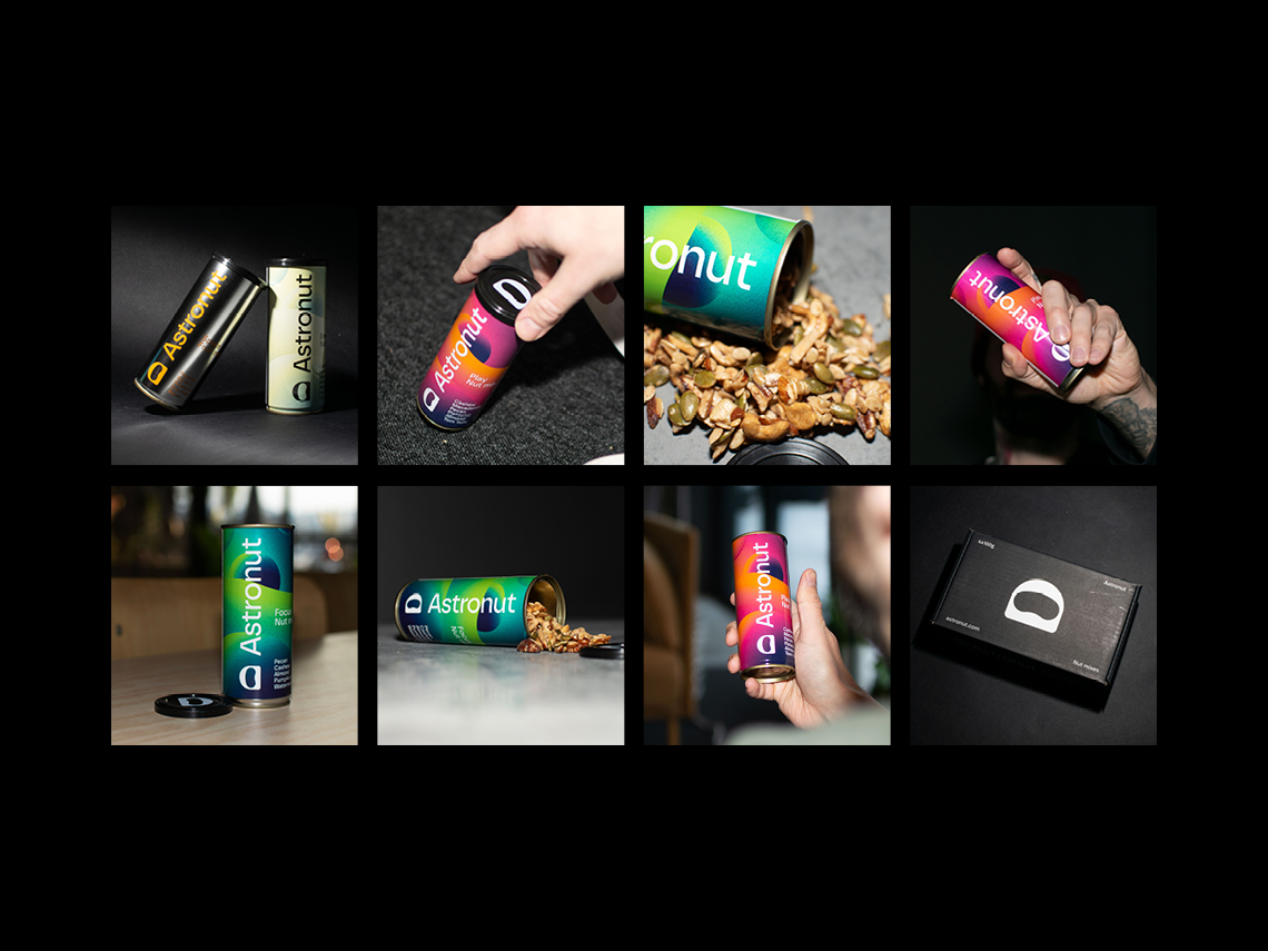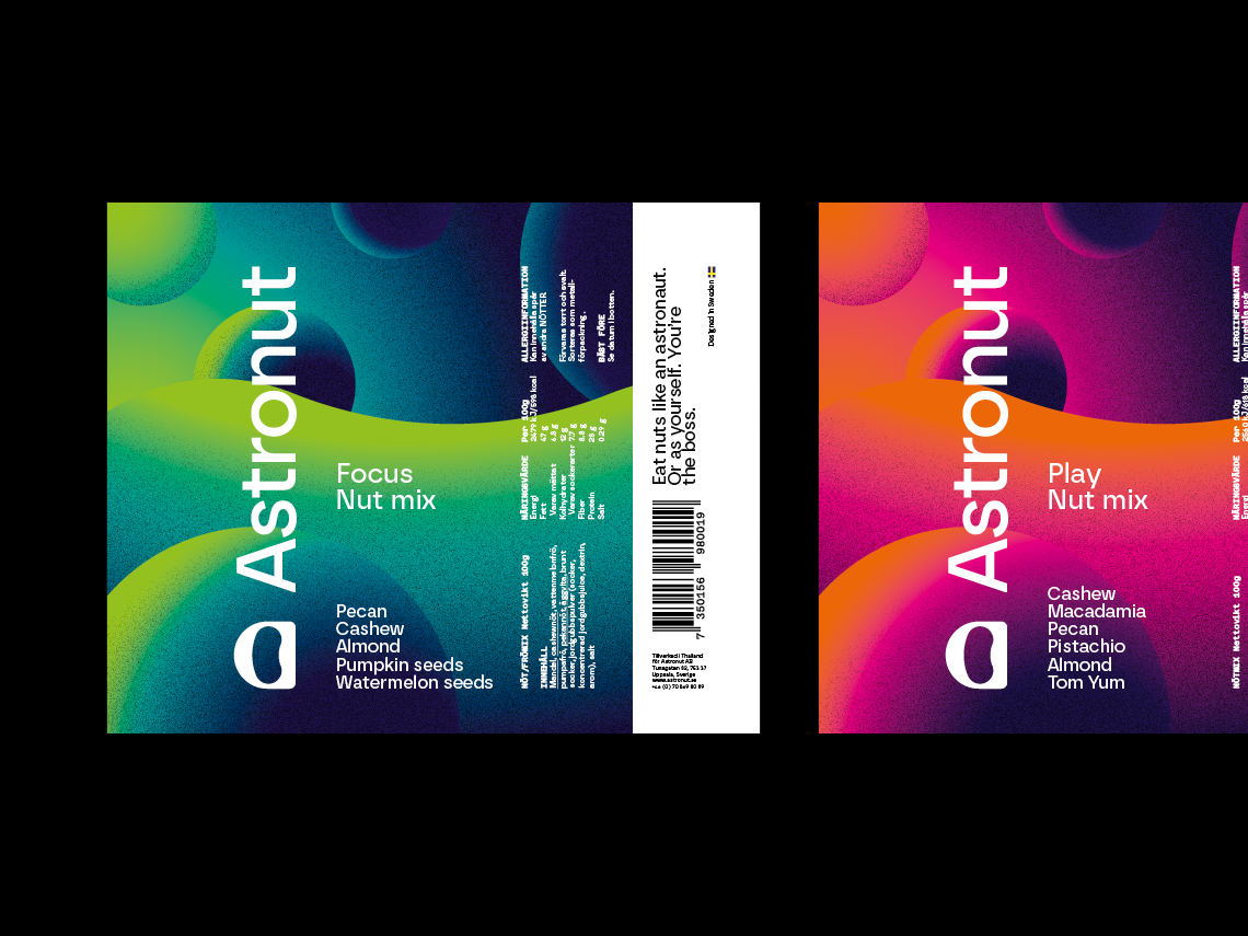 Förpackningsdesignen speglar Astronuts identitet med lekfulla och futuristiska inslag. Genom unika illustrationer och en distinkt färgpalett skapades en visuell helhet som förstärker varumärkets position på marknaden.