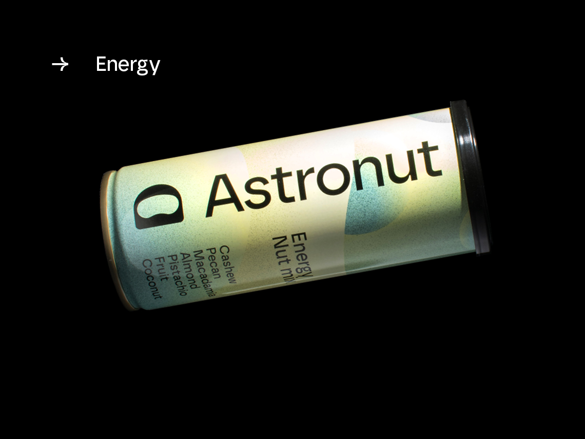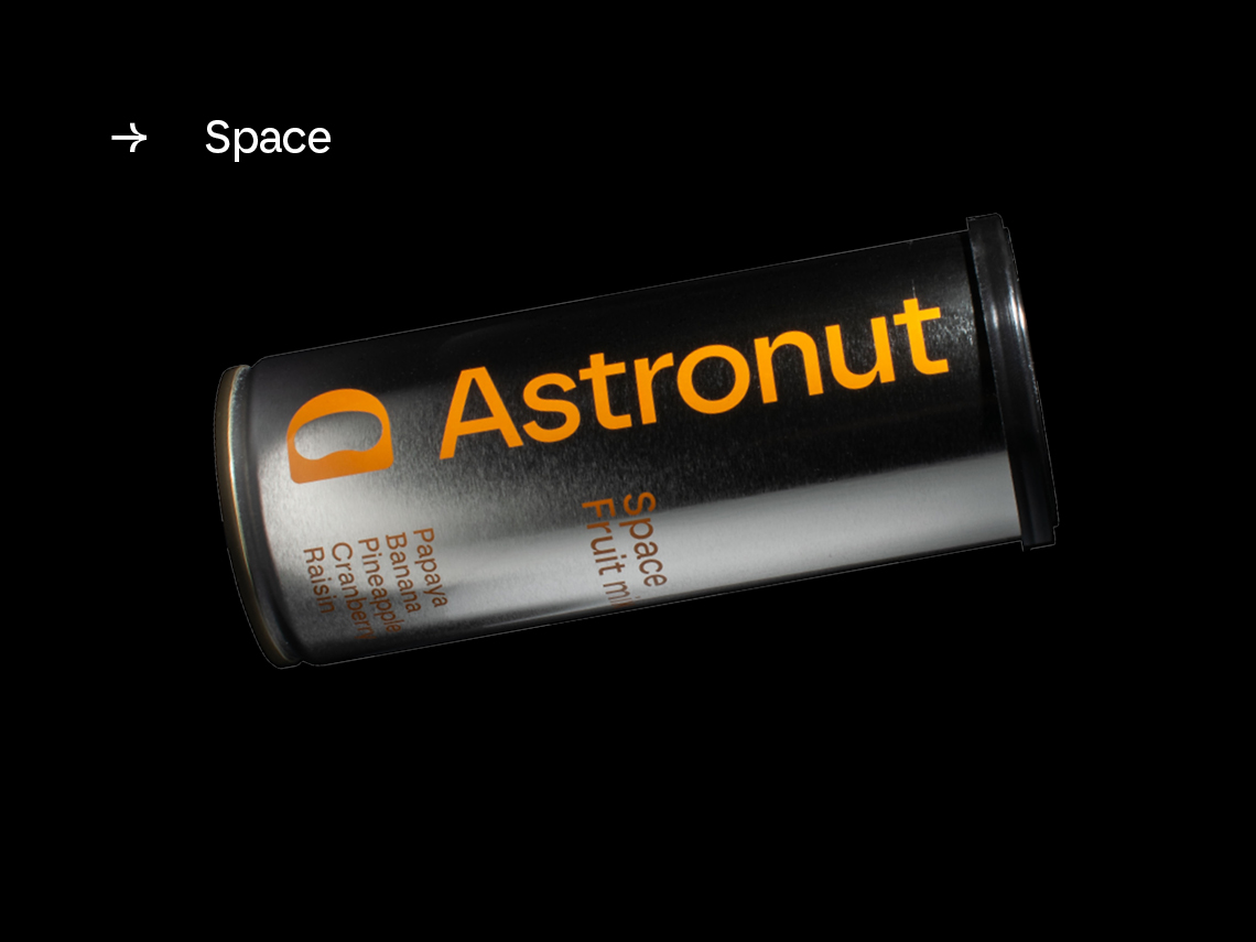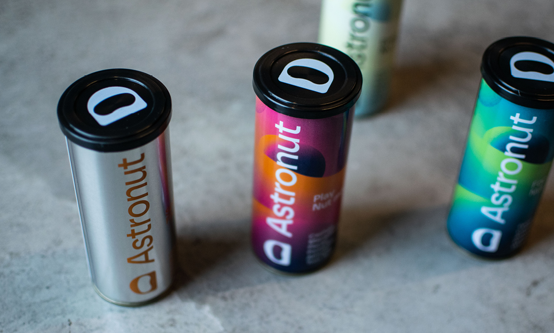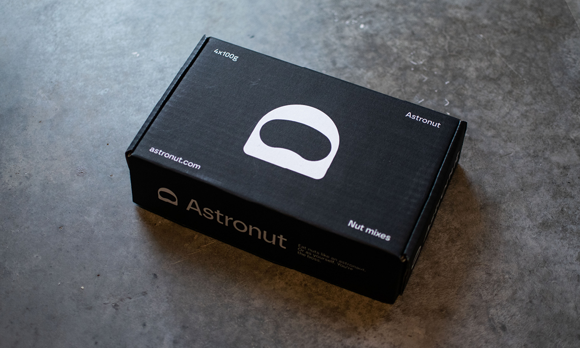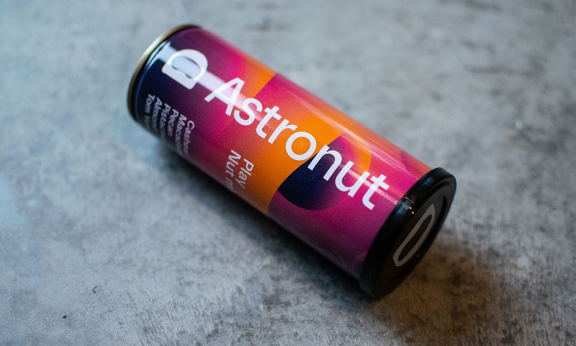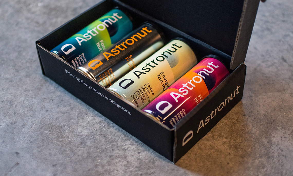 Astronut tillverkar nötmixar i återförslutbara burkar. Produkten kan konsumeras utan att kunden behöver ta i själva nötterna, utan istället häller i sig mixen likt en dryck.