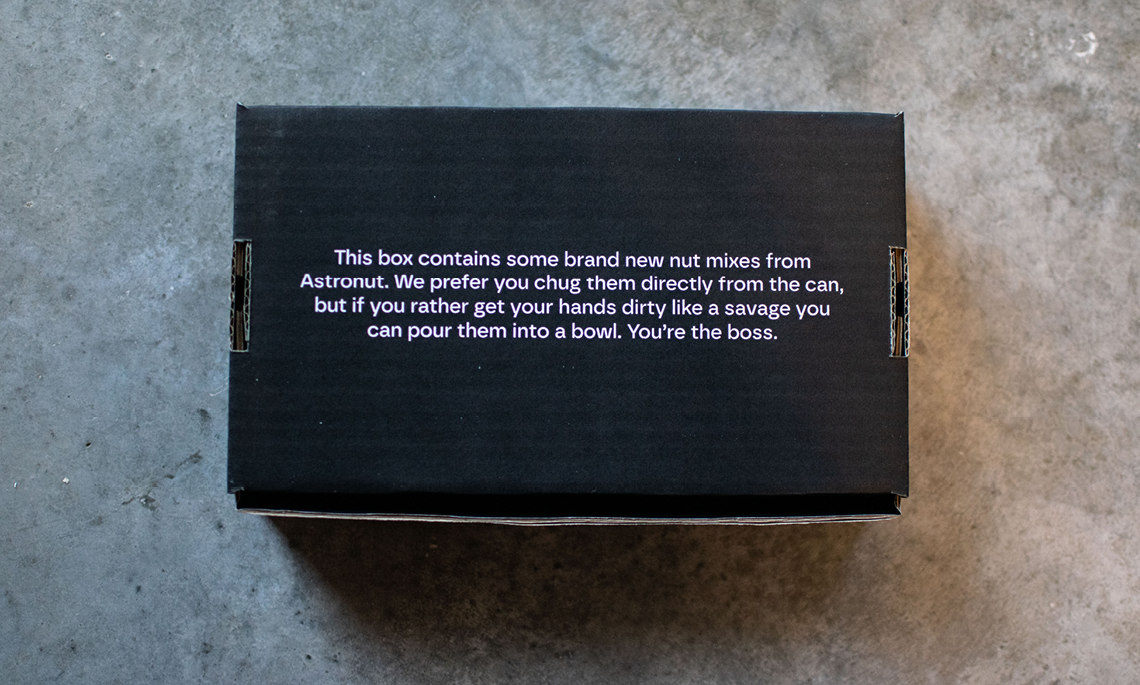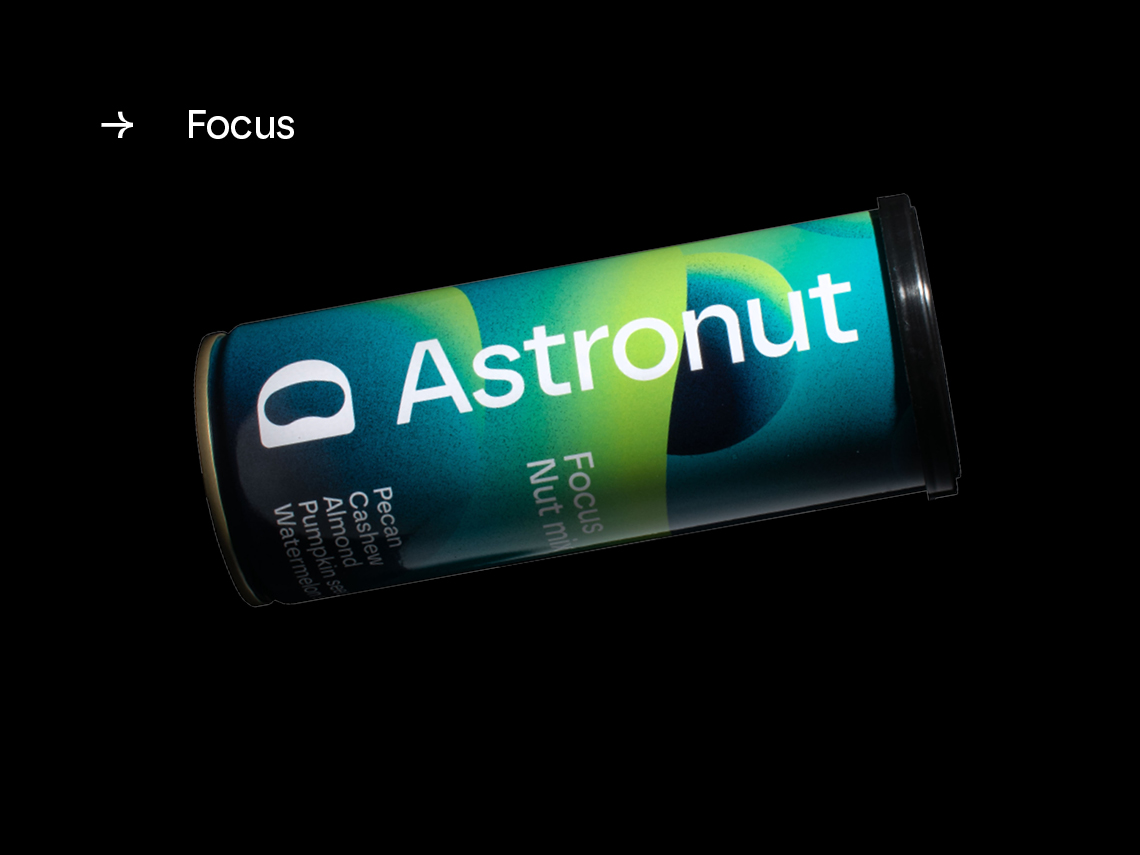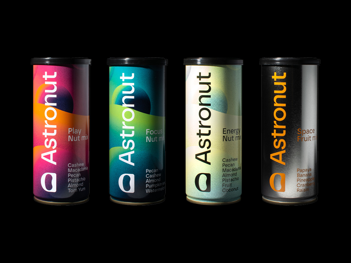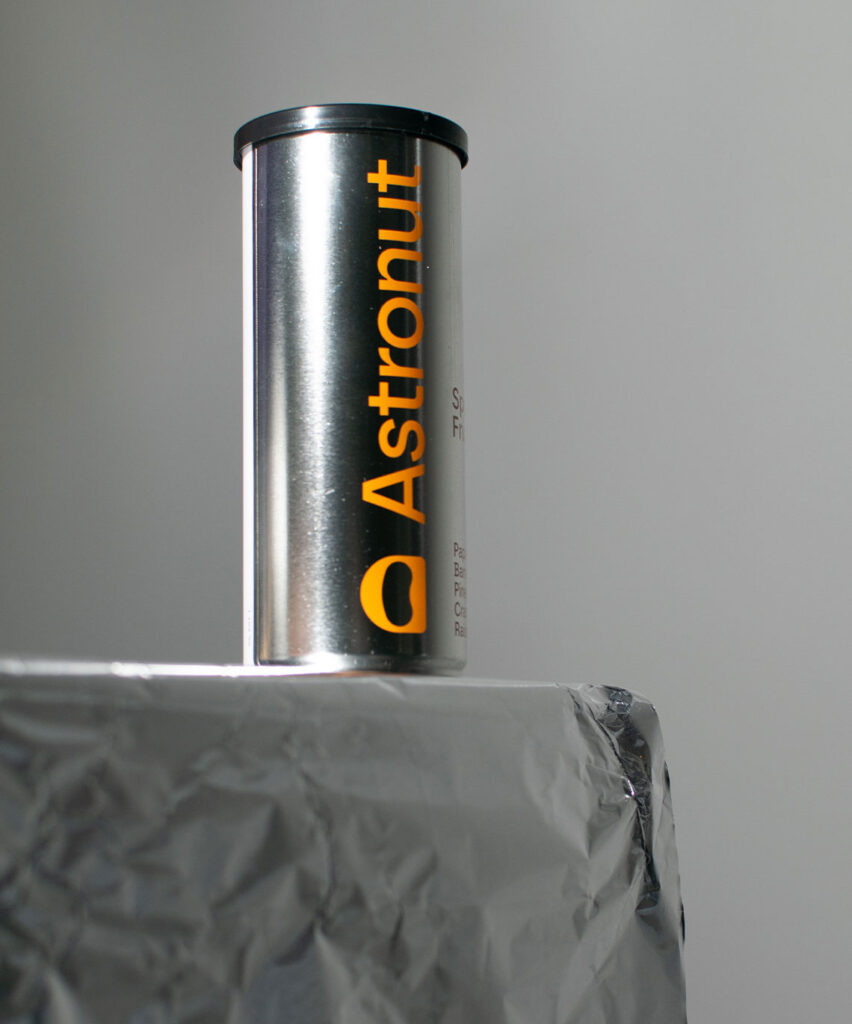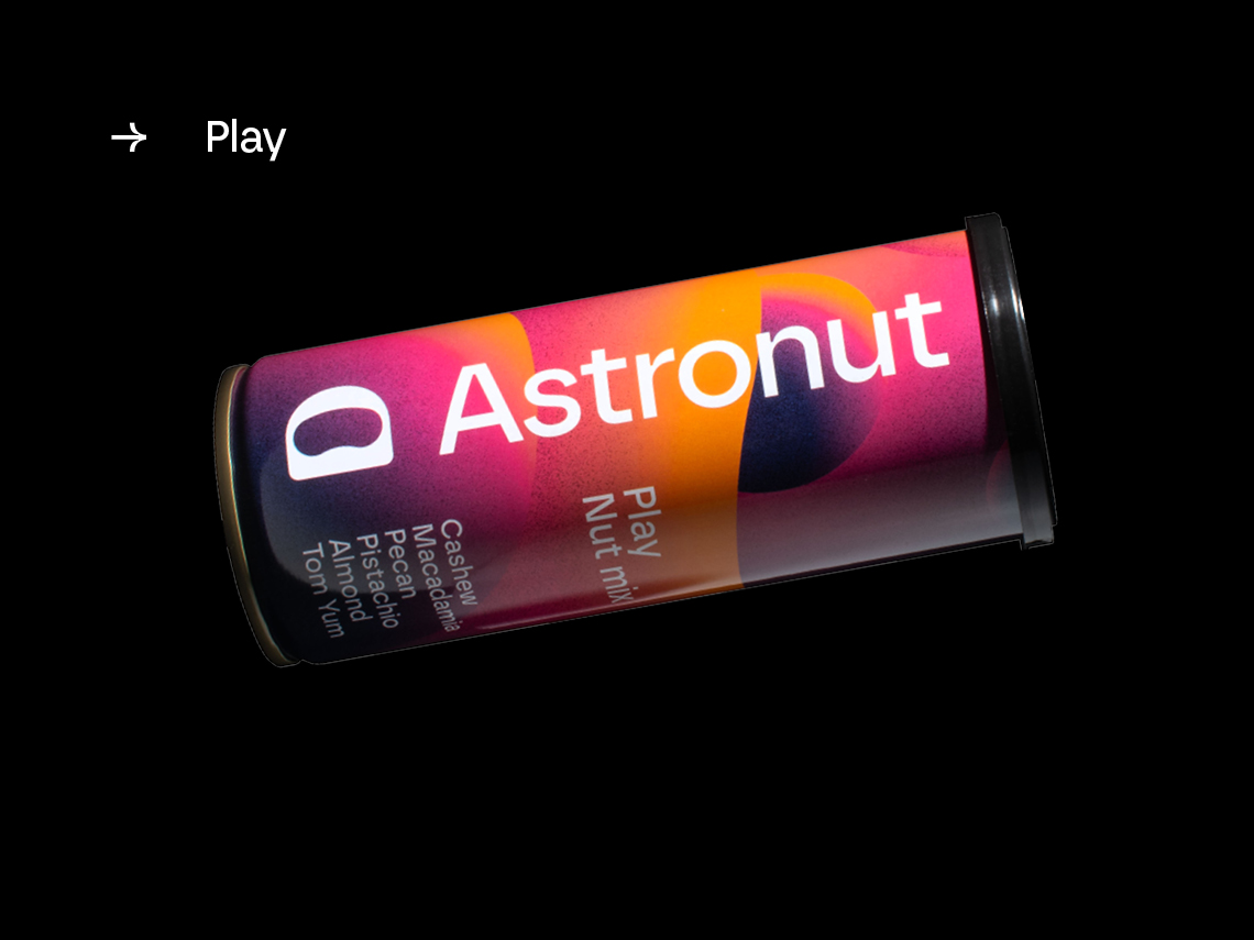 Astronut tillverkar nötmixar i återförslutbara burkar. Produkten kan konsumeras utan att kunden behöver ta i själva nötterna, utan istället häller i sig mixen likt en dryck.