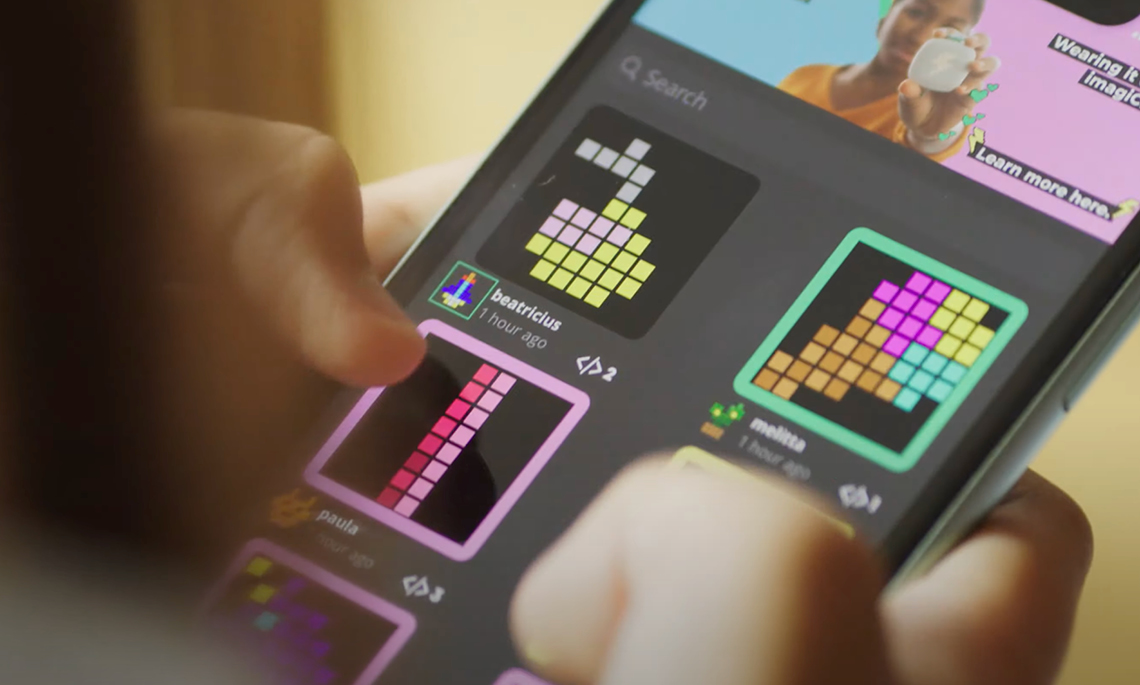 imagi har också en fysisk produkt – imagiCharmen, en stilren dosa med 64 lysdioder. Det användaren skapar i appen kan laddas upp på dosan, vilket gör att mönstren och formerna kan bäras med överallt.