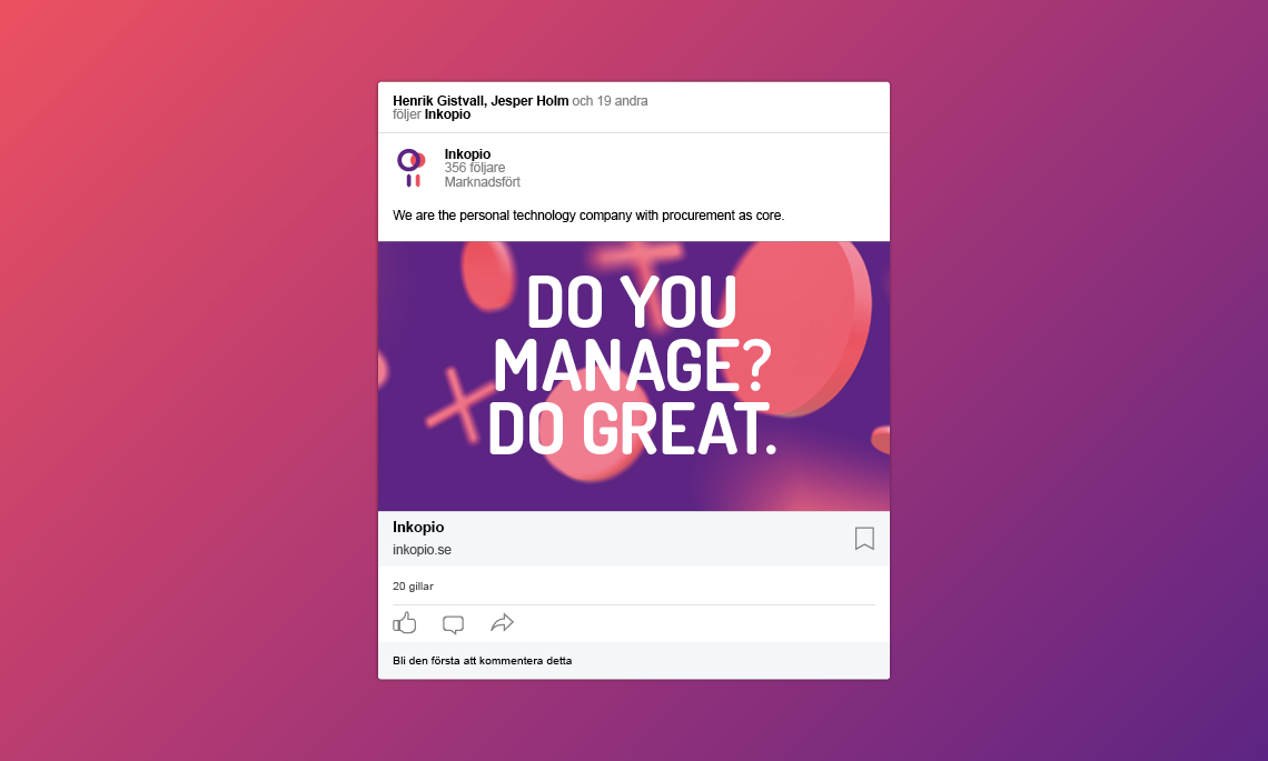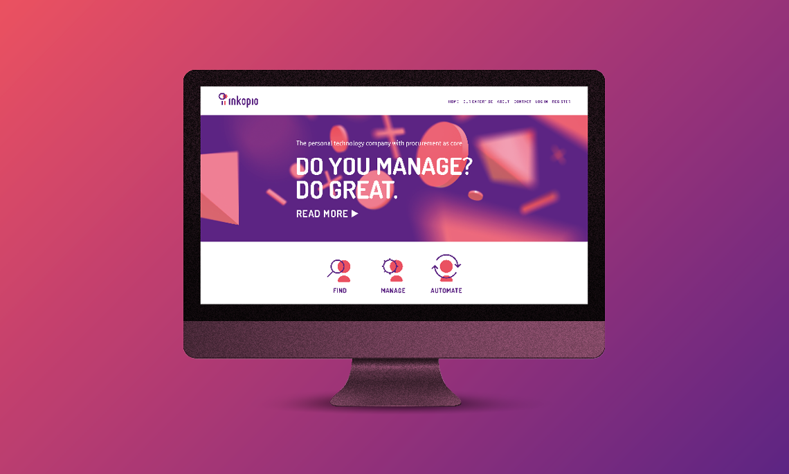 Inkopio behövde en mjukare visuell framtoning för att matcha sina värden med människan i fokus. Samtidigt ville man inte tappa kopplingen till det digitala. Mörklila och röd är två varma färger som sticker ut mot konkurrenterna och ger Inkopio en tydligt egen position. Val och typsnitt och grafik är valda för att befinna sig i gränslandet mellan det lekfulla, mänskliga och tekniska. Symbolen visualiserar förstoringsglaset, konsulten och att stå tillsammans.