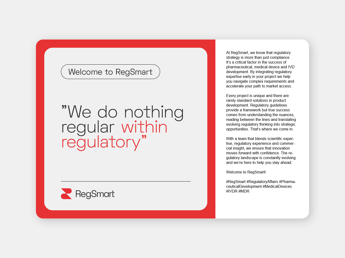 RegSmart är ett varumärke i rörelse – från labbmiljöer och regulatoriska sammanhang till internationella möten och LinkedIn-flöden. Det nya uttrycket stödjer företagets position som specialist och partner. Och kanske viktigast: det skapar kontakt, engagemang och förtroende.