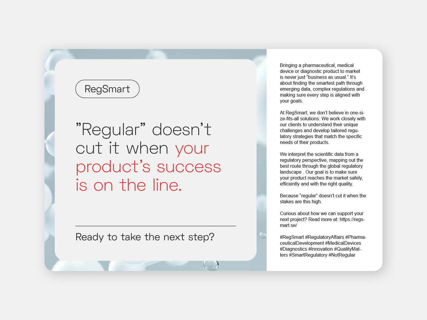RegSmart hjälper life science- och medtech-bolag att navigera komplexa regulatoriska krav. Med skarp affärsförståelse och hög specialistkompetens är de mer partner än konsult. När RegSmart ville stärka sitt uttryck och ta plats digitalt fanns det ett tydligt utgångsläge: det här är inte ett vanligt regulatoriskt bolag.
